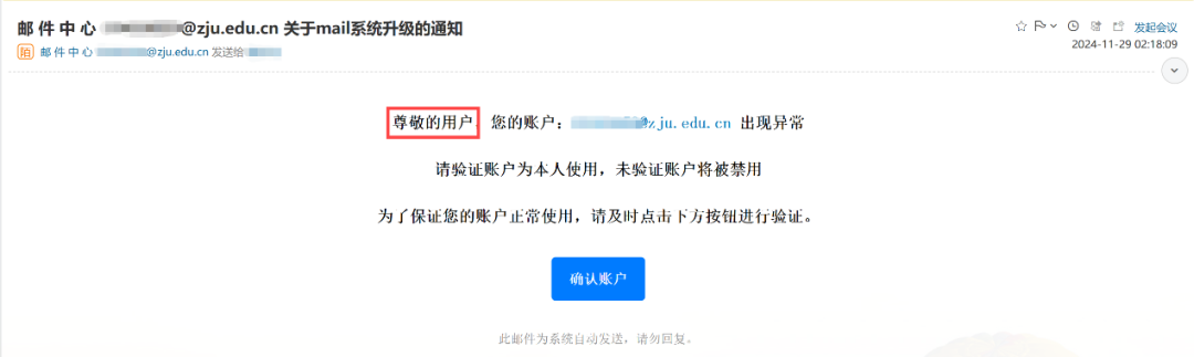 1. 看发件人地址:钓鱼邮件通常会对发件人地址进行伪造,设置近似本单位名称或者系统管理员的账号,如“zju.eud.cn”、“zjut.edu.com”和“zjnu.edn.cn”。